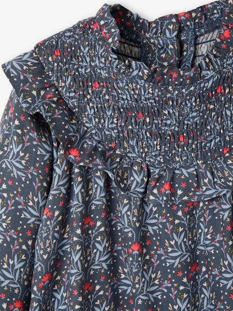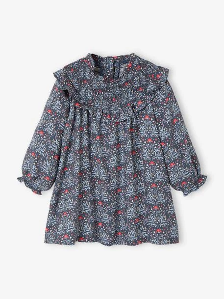 Une encolure en smocks soulignée d’un volant et un imprimé délicat, une robe raffinée parfaite pour les jours de fête et les repas de famille.