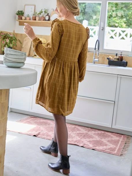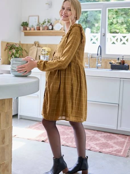 Subtilement irisés, les carreaux donnent le ton. Ampleur étudiée et détails volantés, la coupe signe l’allure ! Vous allez adorer porter cette robe tout au long de la grossesse pour son confort et son style lumineux, mais aussi pour la douceur et la fluidité de sa matière. Une pièce moderne et féminine qui permettra, pour celles qui le souhaitent, un allaitement facile et discret grâce à son boutonnage devant.