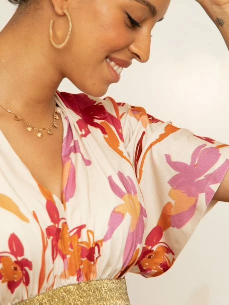 Cette robe de grossesse, réveillée par une ceinture élastiquée dorée sera la complice incontournable de toutes vos soirées de fête. Sa matière très fluide est particulièrement agréable à porter et ses manches papillons lui confèrent un look très féminin. Un modèle conçu pour mettre en valeur le ventre arrondi des femmes enceintes sans rester trop près du corps. Vous serez séduite par son décolleté plongeant qui fera de vous une future-maman glamour et facilitera les moments de l’allaitement après la naissance. Un incontournable d’Envie de Fraise.