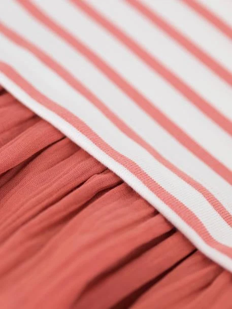 - Robe bi-matiĂšre : haut en jersey coton Ă©pais, bas en gaze de coton pour un effet trompe l’oeil